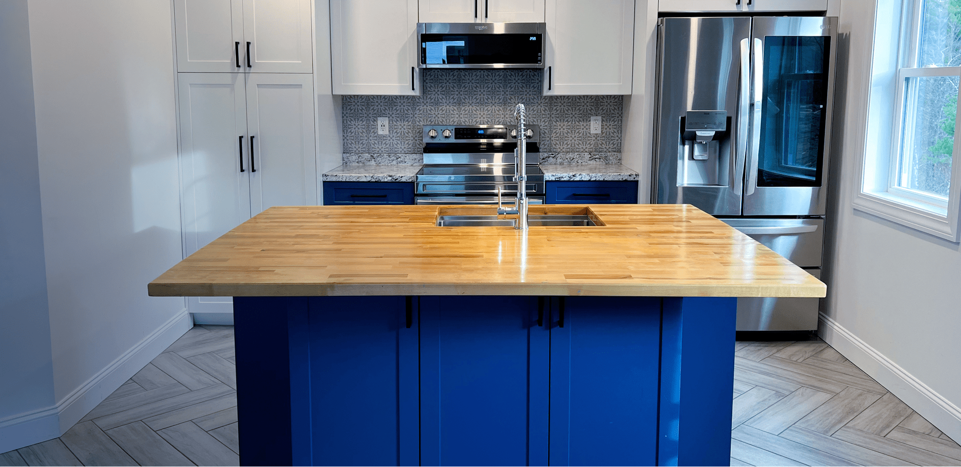 The butcher block countertop is the jewel in the crown. It offers a furniture-like finish and a long-lasting beauty, adding rich color, a timeless appeal, and texture to this white & Downpour Blue kitchen, creating a healthy mix of warmth and coolness.